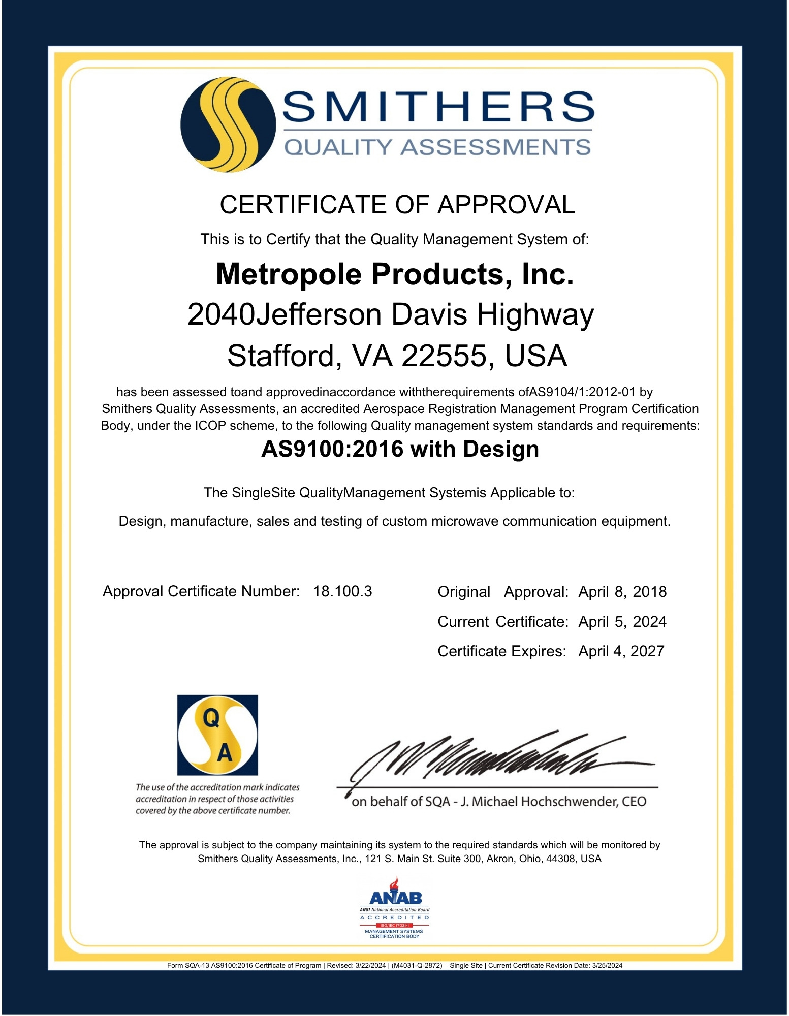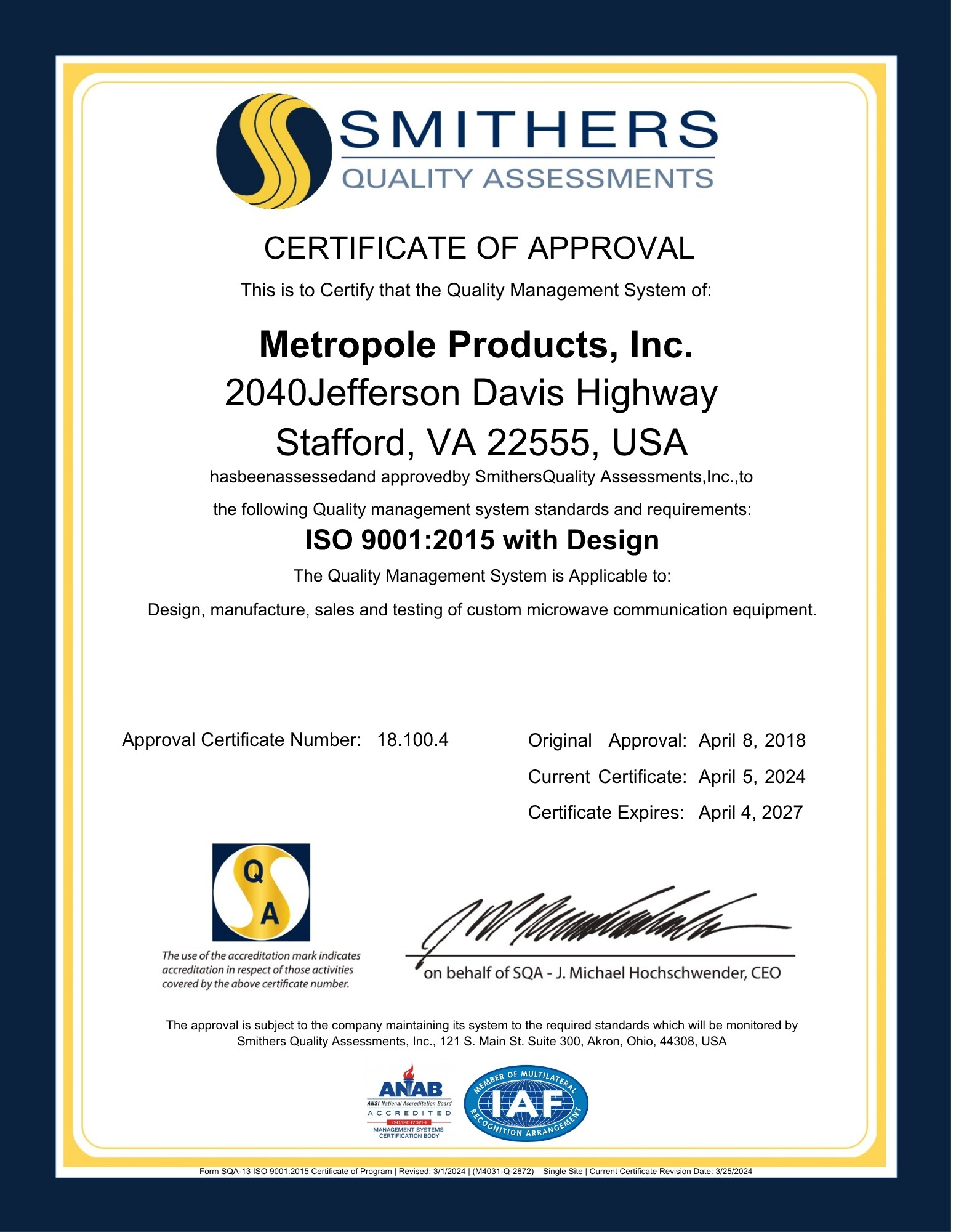 At Metropole, quality and precision are the foundation of everything we do. We uphold the highest industry standards across our design, manufacturing, and assembly processes to ensure exceptional performance and reliability. Our commitment to rigorous quality control is reinforced by globally recognized certifications, validating our expertise in RF and microwave communication solutions.